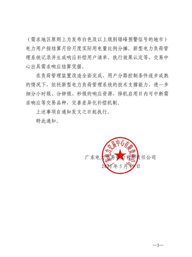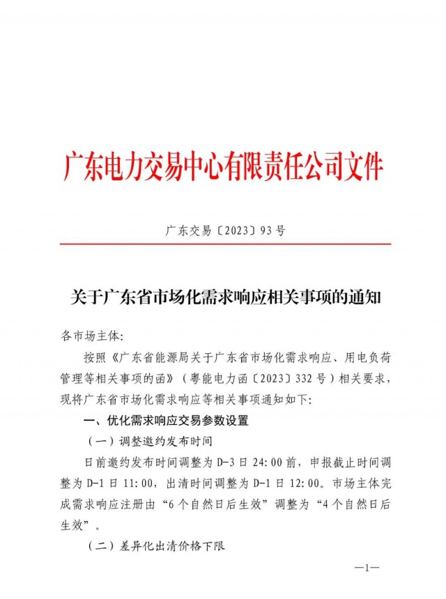 近日,广东电力交易中心发布关于广东省市场化需求响应相关事项的通知。《通知》明确:对于D-2日24:00前申报且中标的用户,日前邀约出清价格下限提高至保底价;对于D-1日申报的用户,其日前调用价格下限保持不变。保底价与珠三角五市10千伏大工业代理购电用户尖峰时段电度电价基本相当,体现尖峰时段的用电价值,暂按1.5元/千瓦时设置。
